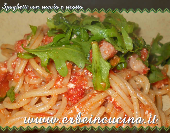 Cuocere normalmente gli spaghetti, scolarli bene al dente e condire con il sugo di ricotta e pancetta e la rucola tagliata grossolanamente.