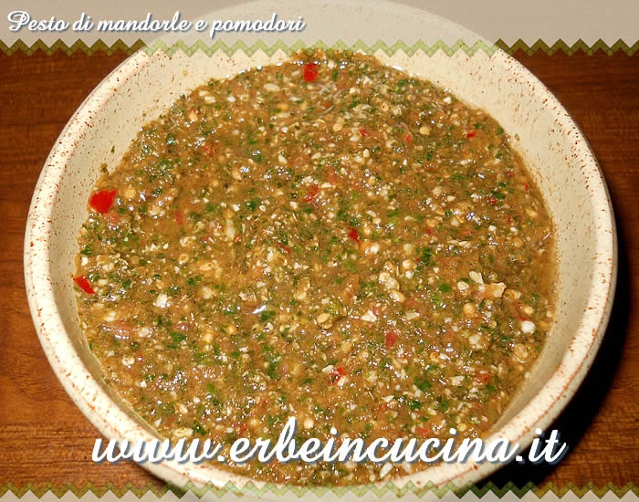 Ammetto che mi aspettavo un colore più rosso per questo pesto, ma non mi sono pentita di avere usato molto basilico. Abbiamo usato quasi tutto questo pesto per una spaghettata, e il resto ha insaporito delle bruschette al formaggio.