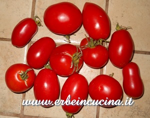 PomodoriColtivo pomodori di diverse varietà, ma ne ho scelti alcuni rossi per un pesto un po' diverso dal solito. Nell'immagine vedete dei perini e dei Muchamiel tardio, una varietà rotonda con buccia sottile, particolarmente dolce.